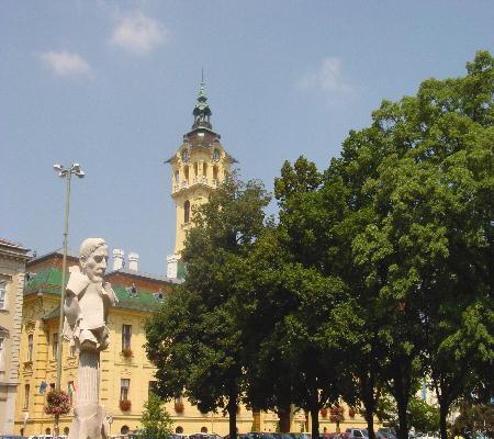 Szeged 2003 - das Rathaus (Neubarock), davor liegt der 5 ha grosse Széchenyi-Platz mit Platanen, Nussbäumen, Bergahorn, Ahorn und Magnolien. Zwischen kunstvollen Blumenbeeten Skulpturen und Brunnen. Einige Statuen stellen die unbekannten Retter dar, anonym gebliebene Helden des Hochwassers.