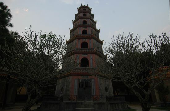 Anschliessend beschliessen wir unsere Kultour, in dem wir dem Sonnenuntergang entgegen am Parfuem-Fluss entlang zur "Thien Mu"-Pagoda radeln. Auch dort so gut wie niemand mehr. (wisse Reisender: willst Du zur Thien Mu, fahr' dorthin gegen Abend zu). Dann zurueck Richtung Hotel, beschwingt durch ein unterwegs eingenommenes "Huda"-Bier (lokales Gebraeu) in einem skurrilen "Night-Club" fuer Jugendliche.