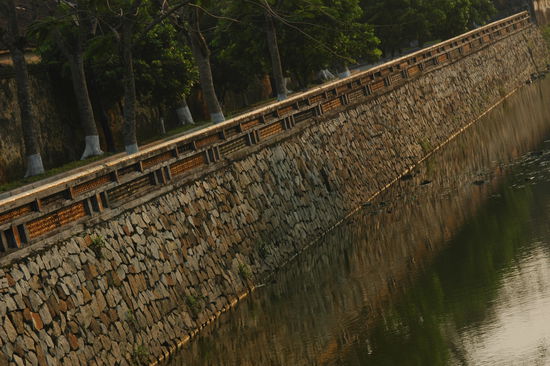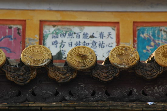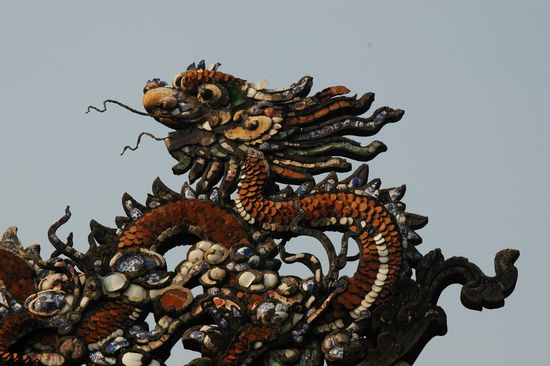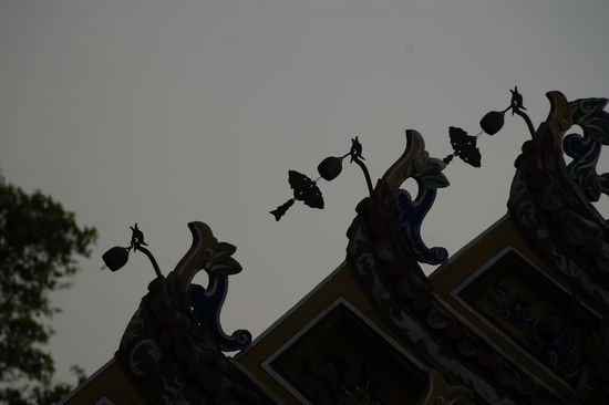 Unser Kultour-Kurzaufenthalt in Hue ist schnell erzaehlt. Hotel gut. Wetter auch. Hue ist die drittgroesste Stadt Vietnams und war waehrend des Vietnamkrieges wegen der Naehe zur Demarkationslinie zwischen Nord- und Suedvietnam Schauplatz heftigster Kaempfe, Zerstoerungen und unermesslichen menschlichen Leidens. Einst war Hue die Hauptstadt Suedvietnams und beherbergte den Kaiser in einer gewaltigen Zitadelle am Ufer des Parfuemflusses (heisst wirklich so), genauer gesagt in einer Zitadelle innerhalb der Zitadelle, der Verbotenen Rosafarbenen Stadt. Dorthin radeln wir fruehnachmittags und sind entzueckt. Ob der leicht vorgerueckten Stunde verfluechtigen sich die Besuchermassen allmaehlich und ueberlassen uns eine friedliche Atmosphaere in bestem Fotolicht (wisse Reisender: kommst Du nach Hue, geh' in die Zitadelle nach dem Nachmittagstee). Auch gefaellt uns, was von der Kaiserstadt uebrig geblieben ist, ganz besonders aber die "Dien Tho"-Residenz der Kaisermutter.