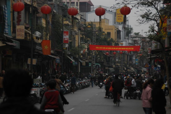 Nach einer tagfuellenden Zugfahrt, die uns nur sporadisch durch wirklich aufregende Landschaft fuehrt, erreichen wir am 26. Februar Hanoi. Es ist kalt. Wieder muessen wir uns mit unseren schweren Rucksaecken zwei Mopedfahrern anvertrauen, die mit uns durch den spaetabendlichen Verkehr Hanois zum Hotel rasen. Instinktiv druecken wir unsere Beine so fest es geht an die des Fahrers, um unsere Kniescheiben vor Kollisionen mit anderen Mopeds oder sonstigen Hindernissen zu schuetzen. Nicht-invalid schaffen wir es in unser Quartier. Schon der erste Eindruck der Altstadt Hanois ist sehr positiv. Sollte sich die Gesetzmaessigkeit, dass uns alles, was in Vietnam mit "H" beginnt, besonders gefaellt, tatsaechlich bewahrheiten?