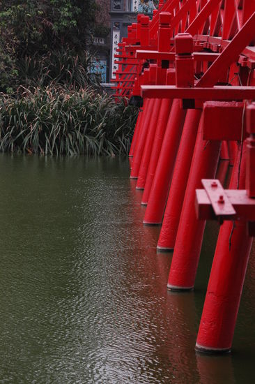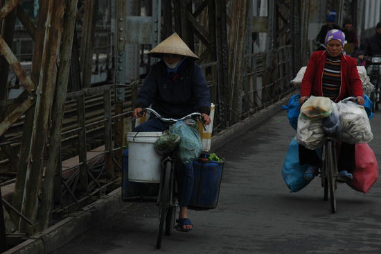 Da wir wagemutige Reisende sind, fuegen wir in der im Reisefuehrer vorgeschlagene Route durch die Altstadt hier und da kleine Extraschleifen an und ueberqueren so auch ueber eine Bruecke den Roten Fluss, der offensichtlich nur aus ideologischen Gruenden so heissen kann. Die betagte Stahlkonstruktion haelt eher aus Gewohnheit denn aus konstruktiven Gruenden noch zusammen, und ein vorbeifahrender Zug bringt das Ganze derart in Schwingungen, dass wir froh sind, wieder Festland zu erreichen.