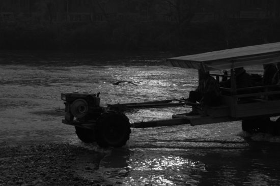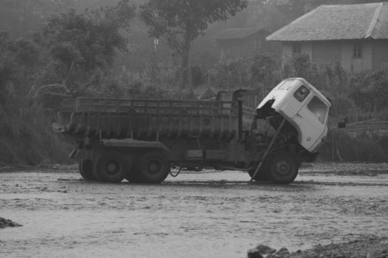 Vier Stunden spaeter erreichen wir Vang Vieng und marschieren los, einer Kette von Enttaeuschungen entgegen. Nachdem alle Unterkuenfte entlang des Flusses abgeklappert sind, sind wir restlos desillusioniert und treten trotzig-spontan mit der letzten Moeglichkeit am gleichen Tag die Rueckreise nach Vientiane an, ein Sammeltaxi (ueberdachter Pick-Up mit Sitzbaenken: "Songthaew"), zugig, nicht sonderlich bequem, aber ausschliesslich besetzt mit freundlichen, zuvorkommenden Laoten, keine benimmfreien Bleichgesichter.