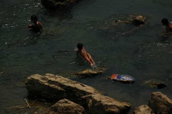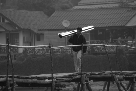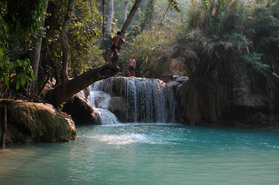 Am naechsten Tag, schon routinierter, starten wir frueh und brausen durch wahrlich beeindruckende Karstlandschaft noerdlich von Vang Vieng den Bergen von Zentral-Laos entgegen. Route 13, die als Hauptverkehrsader Laos von Nord nach Sued komplett durchzieht, ist (kurze unasphaltierte Stuecke ausgenommem) in sehr gutem Zustand und ueberraschenderweise ohne nennenswerten Verkehr. Laoten sind darueber hinaus sehr defensive Fahrer, so dass die Konzentration des Motorradfahrers fast ausschliesslich den Kurven und eventuellen gefaehrlichen Verschmutzungen der Fahrbahn gelten kann. Aber diese Sorge erweist sich als gegenstandlos. Aber der Hintern schmerzt arg. Petra, zwischen Fahrer und Gepaeck eingezwaengt und durch sehr hoch angebrachte Soziusfussrasten gestraft, beweist hoechste Abenteuerbestaendigkeit. Insbesondere steile Bergabpassagen sind eine Tortour fuer sie, muss doch die stetig nach vorne draengende Last ihres Koerper und des Gepaecks staendig zurueckgehalten werden, um nicht schlussendlich einzig ueber wenige Zentimeter Oberschenkelmuskulatur des Fahres auf den Tank abgetragen zu werden. Aber welche Entschaedigung haelt Laos fuer uns bereit. Atemberaubende Gebirgslandlandschaft, dramatisch auf Bergruecken angesiedelte Doerfer, die beim Durchfahren klar bezeugen, wie arm Laos ist. Trotz aller koerperlicher Leiden geniessen wir diese Etappe ausserordentlich und koennen sie motorradkompatiblen Zeitgenossen nur nachdruecklichst empfehlen.