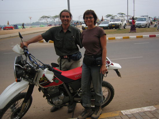 Am naechsten Morgen sind wir in aller Hergottsfruehe an der Anlegestelle und bald hieven kraeftige Haende unser Motorrad auf das Dach des Passagierbootes. Es dauert weitere geraume Zeit, bis alle Passagiere eingestiegen sind. Wie immer, wenn moeglich, sitzen wir auf dem Dach und geniessen den Panoramablick. Der Flussabschnitt zwischen Pak Lay und Vientiane ist eine irrsinnig schoene und hoechst aufregende Mischung aus Felskanal, Stromschnellen und kilometerbreiten Flusspassagen, die an Si Phan Don erinnern. Auf ungefaer halben Weg markiert eine riesige Buddha-Statue die Stelle, ab der das westliche Mekongufer zu Thailand gehoert. Die krass unterschiedlichen Entwicklungsstadien von Laos und Thailand zeigen sich deutlich an den gegenueberliegenden Ufern. Das Abenteuer (das Abenteuer!) holt uns ein letztes Mal so richtig ein. Wir geraten in einen heftigen Tropenregenschauer und koennen auf dem Dach sitzend nur mit viel Glueck unsere Ausruestung vor dem totalen Nasswerden retten. Wir selbst werden kraeftigst nass und erwarten, die restlichen Stunden auf dem Boot und die verbleibende Strecke Motorradfahren dergestalt hinter uns bringen zu muessen. Aber Petrus hat Erbarmen, schickt Sonne und warmen Wind und binnen Kurzem sind wir wieder voellig trocken. Glueck gehabt. Ca. 10 km oberhalb von Vientiane ist sie dann zu Ende, unsere Flussreise, an schwierigem Terrain legen wir an und wieder finden sich starke Haende das Motorrad an Land zu wuchten. Ein letztes Mal beladen wir den Gaul und reiten in die Stadt. Dort sehen wir das erste Mal seit Verlassen von Luang Prabang wieder andere Touristen.