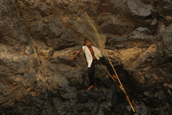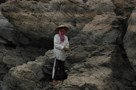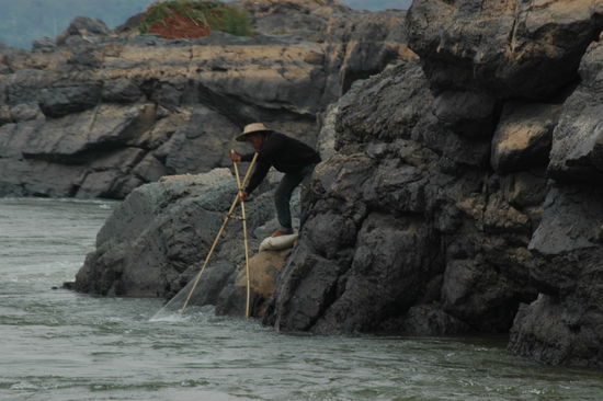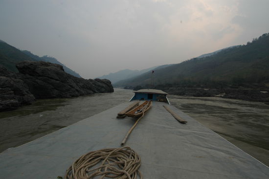 Wir haben wichtigeres zu tun. Wir muessen schauen. Welch urgewaltige Szenerie, die alle immer wieder kolportierten Plaene, den Mekong alljaehrig fuer grosse Schiffe befahrbar zu machen als groessenwahnsinniges Geplapper Ahnungsloser entlarven, gluecklicherweise. Jetzt in der Trockenzeit zeigt der laotische Mekong sein unzerstoerbares Herz aus Fels. Der Fluss, der eine Breite von 14 Kilometern ereichen kann (in Si Phan Don im aeussersten Sueden von Laos, -> "Mutter aller Wasser") ist schon Mitte Maerz ueber weite Strecken zwischen Luang Prabang und Vientiane auf einen verbleibenden wasserfuehrenden Felskanal von weniger als 100 Meter (!) reduziert, durch den die Wassermassen tosend hindurchschiessen. Beidseitig des Felskanals erstrecken sich zerklueftete Felsplateaus, die haeufig erst nach jeweils vielen hundert Metern das eigentliche Ufer erreichen. Diese zu anderen Jahreszeiten ueberfluteten Felsbaenke sind jetzt sichtbar und beweisen beaengstigend eindruecklich, welche Kunst das Navigieren auf dem Mekong zu jeder Zeit sein muss. Spaetestens hier und jetzt wird klar, warum die Boote in Laos ihre einzigartige Form haben: sehr lang und sehr schmal, aeusserst wendig, die "Kapitaensbruecke" meist im Bug. Mit groesstem Respekt beobachten wir unseren Kapitaen, wie er, haeufig unterstuetzt von einem der beiden Schiffsjungen, das Steuerrad des Bootes (Low-Tech in Vollendung) staendig heftig hin- und herbewegt und mitunter frontal auf Felsinseln zusteuert, um erst im letzten Moment, unterstuetzt durch die reissende Stroemung, das Boot behende um das Hindernis herum zu manoevrieren.