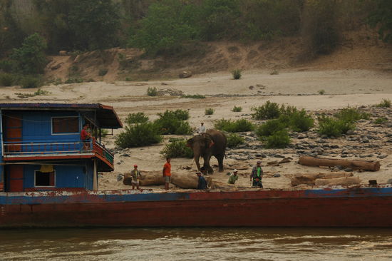 Wie seit Jahrhunderten werden Elefanten eingesetzt, um die gefaellten Baeume aus dem Wald zu den Schiffen am Mekong zu bringen