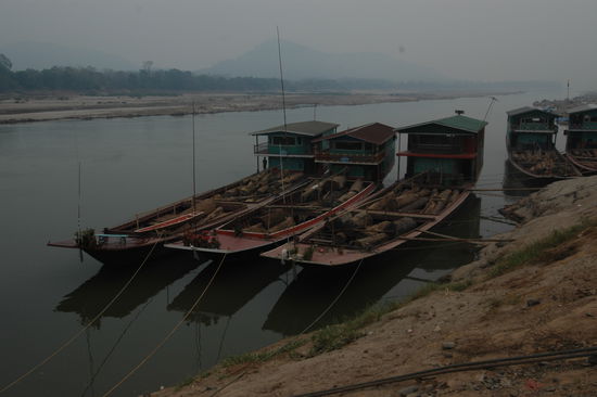 Um sieben Uhr sind wir bereits wieder unterwegs. Deutlicher als am Vortag sehen wir die Auswirkungen der Urwaldausbeutung, ueberwiegend als Branddrodung durchgefuehrt, offensichtlich weniger zur Anbauflaechengewinnung denn um an begehrte Tropenhoelzer zu gelangen. Teilweise sind vom Fluss weg ueber Kilometer ins Hinterland Huegelreihen bereits vollstaendig abgefruehstueckt. Wie haeufig in den Tropen dient auch hier der Fluss als primaere Erschliessungsschneise, um zu den Baeumen zu gelangen und sie nach dem Faellen abzutransportieren. Die vielen verbleibenden Urwaldsprengsel, die wir merkwuerdigerweise zumeist unmittelbar am Ufer sehen, sind daher gleichzeitig grandios und deprimierend. Am fruehen Nachmittag erreichen wir Pak Lay, eine Relaisstation der Tropenholzindustrie, mit der Aussenwelt nur verbunden durch den Mekong und staubige Urwaldpisten. Hier muessen wir einen Bootswechsel durchfuehren, denn unsere Boote werden hier ihre vieltausendsaeckige Ladung lichten (ein haselnussfoermiges weisses Korn, das bei der Bierherstellung verwendet wird ... ? ... mehr konnten wir sprachbarrierenbedingt nicht herausfinden) und kehren dann nach Luang Prabang zurueck.