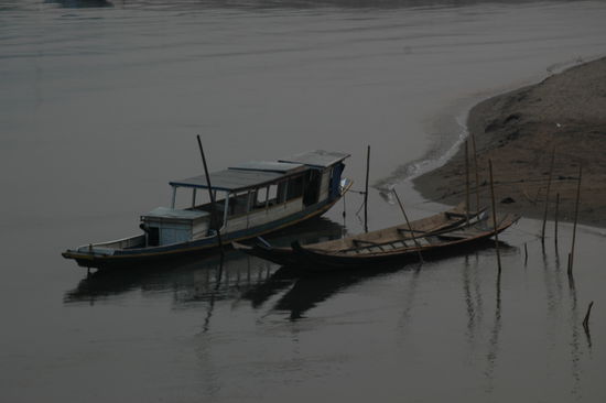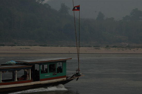 Aus ueberuebermorgen wird ueberueberuebermorgen. Ist recht. Der Tag kommt, und wir sind aufgeregt. Was fuer ein Boot wird es sein? Wie kriegen wir unseren Mustang an Bord? Zunaechst Unerfreuliches in der Mitfahrzentrale. Unerwartete Mehrkosten wegen ... ja wegen was? Wir lehnen entschieden ab. Man geleitet uns dennoch zur Bootsanlegestelle, dort kurz weitere Preisdiskussionen, aber wir lassen uns nur einen symbolischen Betrag abhandeln. Dann setzt es sich fort: das Abenteuer (das Abenteuer!) und mit gemeinsamen Anstrengungen wird das Motorrad ueber zwei andere Frachtkaehne hinweg auf die MS Laos gewuchtet, wo es im Bug einen sicheren Platz findet. Noch ein bisschen hin und her, dann legen wir gemeinsam mit einem Schwesterschiff ab. Wir beziehen Position auf dem Sonnendeck, erkunden unsere Kabine, die Kapitaensbruecke und stellen fest, dass der regulaere Zugang zur Bordtoilette ganz im Heck durch den Frachtraum wegen der Ladung versperrt ist. Bleibt nur der Weg ueber Dach und seitlich die Bootswand herunter, der aber (so soll sich zeigen) fuer uns nicht mit vertretbarem Risiko zu begehen ist. Na und: Abenteuer (Abenteuer!), sollen wir uns da Gedanken machen ueber eventuell draengende Ausscheidungen ...
