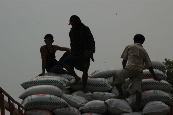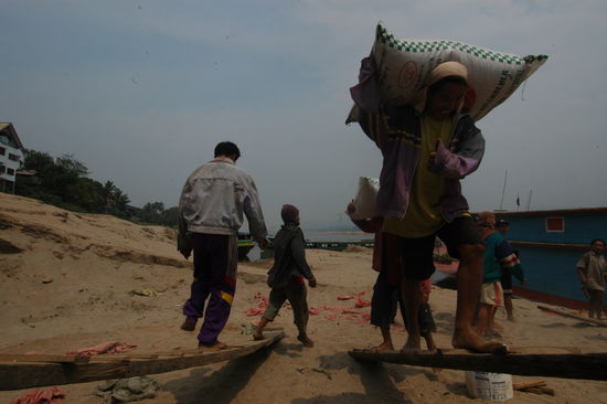 Das Passagierboot nach Vientiane, so stellt sich heraus, faehrt erst uebermorgen. Wir bleiben entspannt, beschliessen ob der Toilettenproblematik aber, nicht eine weitere Nacht auf der MS Laos zu verbringen, sondern ziehen in ein aeusserst rudimentaeres Guest House. Nachdem unser Mustang abgeladen ist, erkunden wir den Ort. Nach ungefaehr fuenf Kilometer in Summe in alle Richtungen haben wir alles Asphaltierte befahren und das gesamte pulsierende Pak Lay gesehen: uff ... laengere Zeit will man hier nicht stranden. Die Bootsanlegestelle ist der bei weitem aufregendste Ort, und wir beobachten, wie unsere Boote entladen werden.