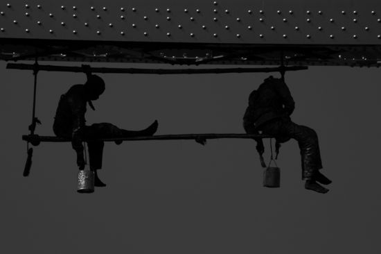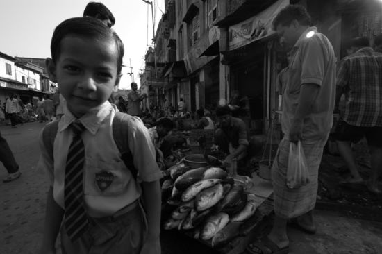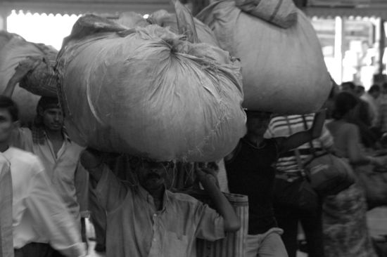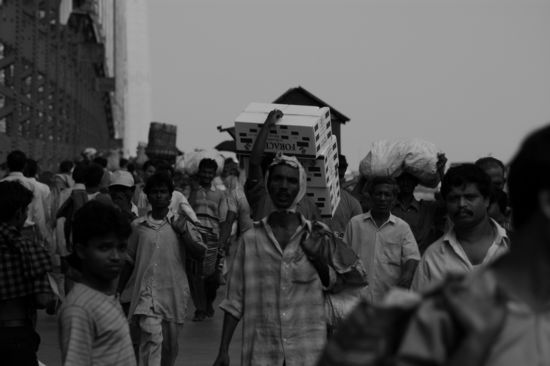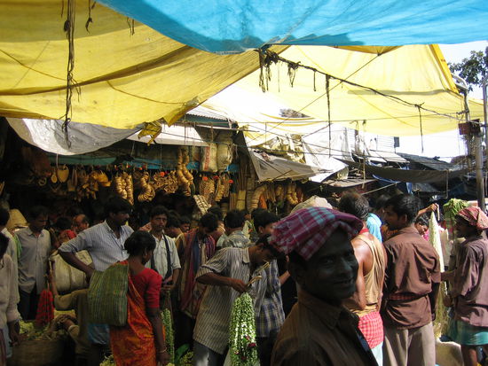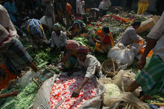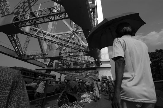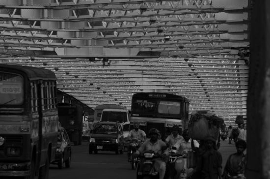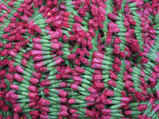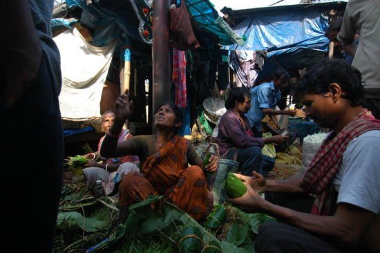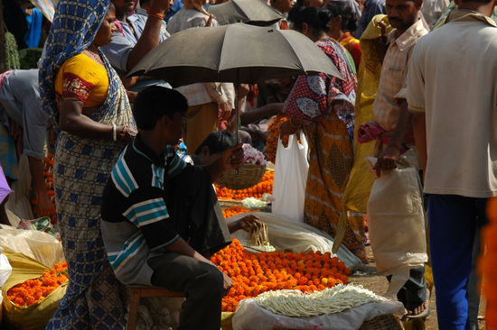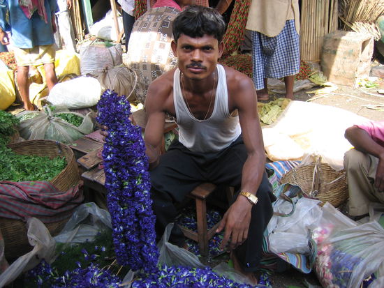 Wir und der Wahnsinn. Materialisiert in und unter der Howrah-Bruecke, wahrscheinlich die belebteste Bruecke der Erde. Eine verwegene Stahlkonstruktion, die 450 Meter Fluss ("Hoogly") stuetzenfrei ueberspannt und von taeglich hunderttausenden Fahrzeugen und noch viel mehr Menschen frequentiert wird. Am jenseitigen Ende der Howrah-Bahnhof. Dorthin muessen wir, um unsere Zugfahrkarten Richtung Darjeeling zu erstehen. Gute Gelegenheit, das Erforderliche mit dem Aufregenden zu verbinden. Hinzu ueberqueren wir den Hoogly mit einer Faehre, aber rueckzu benutzen wir die Bruecke und tauchen am anderen Ende ein in einen dampfendheissen Zauber aus Blueten und Farben. Dort, unter der Bruecke, befindet sich der groesste Blumenmarkt Kalkuttas und alle Tempel der Stadt scheinen von hier mit Bluetenopfern versorgt zu werden. Das Gedraenge dort kann mit Worten nicht beschrieben werden, ebenso der suesslich-modrige Geruch der zerquetschen Blueten, offensichtlich bereits in Fermentierung uebergegangen. Schweiss explodiert aus allen Poren. Mit letzter Kraft erreichen wir die rettende Treppe zurueck auf die Bruecke. Aller Einsatz hat sich gelohnt.