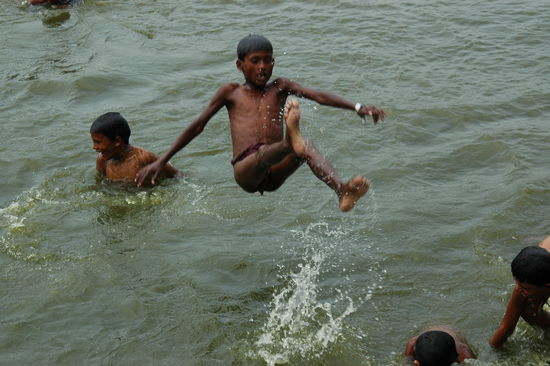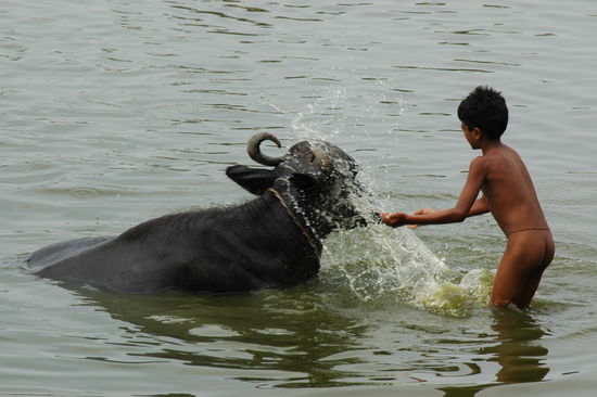 Eigentlich nur als erholsamer Zwischenstop auf dem langen Weg nach Kathmandu gedacht gefaellt uns Janakpur so gut, dass wir einen Tag laenger bleiben und die Badeteiche am Stadtrand per Fahrradrikscha erkunden. Zeitlose Szenerie auch hier. Wasserbueffel und Menschen planschen eintraechtig nebeneinander, aus zahlreichen kleinen Tempeln dringen religioese Sprechgesaenge, mal leise zurueckhaltend, mal grotesk uebersteuert, weil durch riesige Lautsprecher uebermaessig verstaerkt. Dann aber muessen wir sie hinter uns bringen, die angeblich nur vierzehn Stunden Busfahrt bis Kathmandu. Zunaechst kommen wir auch auf guter Strasse rasch voran, bis ein lautes Zischen eine Reifenpanne ankuendigt. Dann fahren wir statt des direkten Weges nach Norden einen riesigen Umweg westwaerts. Bessere Strasse, geht schneller, heisst es. Alles Luege. Bald kriechen wir auf unbefestigter Schotterpiste durch ein wahrscheinlich reizvolles Flusstal. Reizvoll, so man etwas saehe. Wir sehen nur Staub, der durch alle Ritzen und Fugen des Busses dringt, und davon gibt es viele. Jeden angeblichen Zeitgewinn reinvestieren wir in lange Staus aufgrund nur einspuriger Verkehrsfuehrung, schwitzen in der bruetenden Mittagshitze (Staub und Schweiss: schoene Panade) und verfluchen den verfehlten Schnelligkeitswahn. Irgendwann gegen Abend, mittlerweile in unser Schicksal ergeben, glauben wir uns dem Ziel bereits nahe, als ploetzlich jeder Fatalismus in uns entweicht. Vor uns steile Serpentinen, kilometerlang, Bus an Bus, LKW an LKW, der Superstau, und nirgendwo gelbe Engel vom ADAC, die kalte Erfrischungen reichen. Fast drei Stunden quaelen wir uns die Haenge hinauf ohne zu wissen warum. Dann die (Er)Loesung. Wieder eine der zahlreichen Militaerkontrollen, diesmal am Pass ins Kathmandutal. Alle Nepalis muessen aussteigen, jede Tasche wird durchsucht, kein Maoist gefunden. Nach dieser letzten Wehe aber erblicken wir das Licht: Kathmandu. Geschafft.