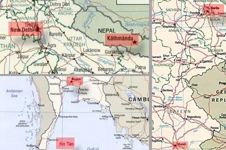 [Die nackten Fakten: Taxi vom Guest House in Pokhara zum Flughafen, Flug von Pokhara nach Kathmandu, Taxi ins Guest House in Kathmandu, Taxi zum Flughafen, Flug nach Delhi, Flug nach Bangkok, Taxi zum Guest House in Bangkok, zu Fuß zum Reisebüro, Pick-Up zum Bus, Bus nach Chumporn, Katamaran-Faehre nach Ko Tao (Mae Haad), Taxi-Boot zum Sai Thong-Resort, Taxi-Boot nach Mae Haad, Katamaran-Faehre nach Ko Samui, Taxi zum Flughafen, Flug nach Bangkok, Flug nach Zürich, Flug nach München, PKW in die Baldurstrasse, PKW nach Berlin in die Mittenwalderstrasse. Ende.]