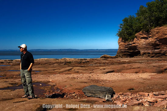 Ich hab ein nettes Plätzchen gefunden. Mit Blick auf die Bay Of Fundy und tollen Klippen. Wo ich angekommen bin war gerade Ebbe. Bin dann los um mir die Klippen anzusehen. Echt irre. Man sieht die verschiedenen Gesteinschichten, wie sie aufeinander liegen und einander runtergedrückt haben. Das alles in verschiedenen Farbtönen und dann ganz lockerer Stein und ganz fester. Und das Wasser kann man nur erahnen. Irgenwo weit hinten sieht man einen Streifen Blau. Ich hab dann meinen Nachbarn getroffen. Der war gerade mit dem Hund Gassi. Der sagte, bei Ebbe kann er 6 km in jede Richtung an den Klippen entlanglaufen. Und bis zum Wasser sind es 1.2 Meilen. Irgendwie fasziniert mich das. Tja, dann geht ich nochmal raus und schau mir an, wie das Wasser reinkommt. Echt toll, da kann man wirklich zusehen. Ich bin ja ein Allgäuer und hab sowas noch nie gesehen. Also in solchen Ausmaßen nicht. Wenn dann die Flut ganz oben ist, dann geht das ganze Specktakel wieder in die andere Richtung. Es erreicht den Höchststand und dann geht es sofort wieder zurück. Keine Pause. Sobald es oben war, geht's wieder runter. Und das alles nur wegen dem Mond. Ich kann's nicht wirklich kapieren. Diese Massen, die da bewegt werden. Einfach unbeschreiblich. Also die Theorie versteh ich natürlich aber wenn man es hier so sieht. Gut es ist auch ein extremes Beispiel, weil ich an dem Ort auf der Welt bin mit dem größen Tidenhub. Ich finds einfach irre faszinierend und beeindruckend.
