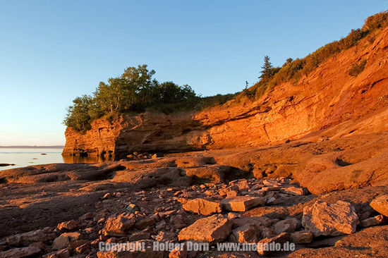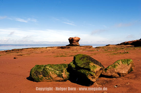 On the road again. Bin dann bis Burncoat gefahren. Da war eine roter Stern auf meiner Karte und da muss man dann halt hin. War auch nicht schlecht. Eigentlich ziemlich Klasse. Geärgert hat sich nur der Fotograf in mir. Für diese Szene muss Ebbe sein und Abendlicht. Aber schön war es auch mit halber Ebbe und Morgenlicht. Hier war einfach eine kleine Insel aus diesem roten Fels und ein paar schöne Felsen. Alles in rot mit grünem Toping oben drauf.
