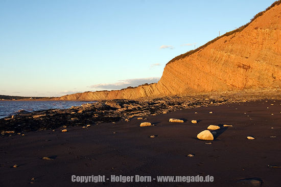 Cape d'Or. Ich bin zum Leuchturm runter und bin dann die kleinen Klippen runtergeklettert um dann am Strand der großen Klippen entlang zu gehen. Ist allerdings nur möglich bei Ebbe. War mein Glück. Das war echt ne Wucht. 200 m hohe Klippen aus den unterschiedlichsten Gesteinen im Sonnenlicht. Dafür hat sich der ganze Tag gelohnt. Das ist so impossant, wenn man da direkt davor steht und hochschaut. Das haut einen echt aus den Latschen.
