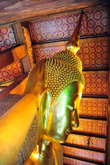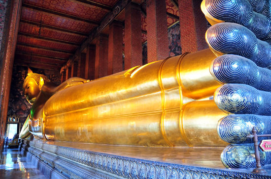 Nach dem Wat Phra Keo wanderten wir um die Palastmauern um zum Wat Pho zu kommen. Hier liegt im Viharn ein 45m langer Buddah, er soll Buddah beim Eintritt ins Nirvana darstellen.