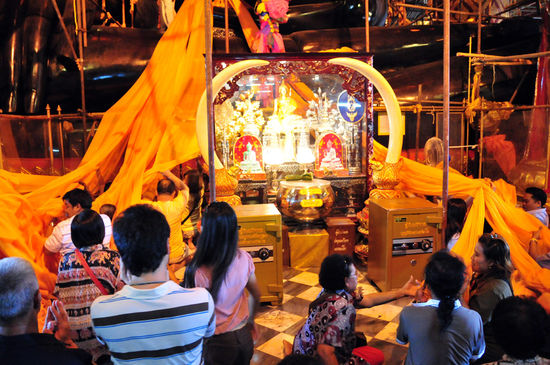 Denach besuchten wir den Wat Phanan Choeng. Hier wurden wir Zeuge eines unglaublichen Zeremonie. Der Tempel wird zur Zeit restauriert und daher braucht der Buddha neue Kleider. So pilgerten hunderte von Leuten in diesen Tempel, Kauften orange Stoffbahnen und opfern diese dem Buddha damit er nicht frieren muss . Ein Erlebnis der Extraklasse....