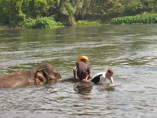 Dort angekommen erst mal mein Baumhaus bezogen und mit den Elefanten zum Baden, ein grossartiges Gefuehl, man sitzt auf den Elefanten, gibt ein Kommando (Mud) und der Elefant geht komplett unter Wasser, ist wie surfen auf einem Elefanten.