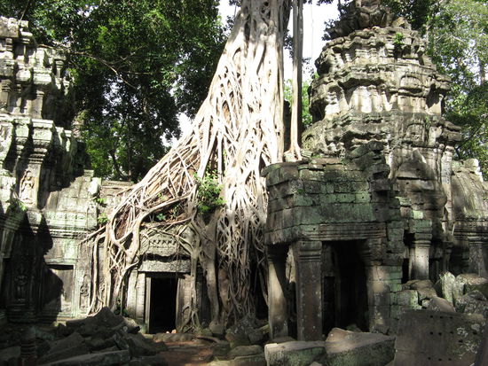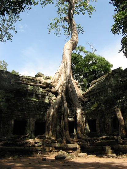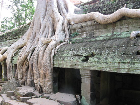 Zur groessten Mittagshitze erreichten wir Ta Phrom, mit Recht eine der schoensten Tempelanlagen von Angkor. Wenn man auf der Suche nach einer mystischen Staette mit von Baeumen umschlungenen Mauern, jeder Menge Verwinkelungen und unzaehligen Gaengen ist, dann ist man in Ta Phrom absolut richtig.
