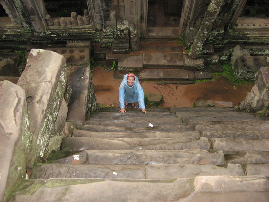Die naechste Tempelanlage musste Manu allein erklimmen. Die Stufen von Ta Kev hatten es in sich. Sie waren nicht nur sehr schmal und hoch sondern fuehrten auch sehr steil nach oben - also nur etwas fuer Schwindelfreie!