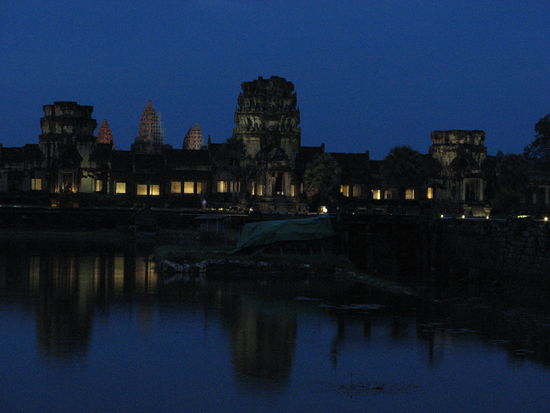 Schliesslich radelten wir noch zum Angkor Wat und genossen den wunderschoenen Anblick der angeleuchteten Tempelanlage, denn mittlerweile war es schon fast dunkel.