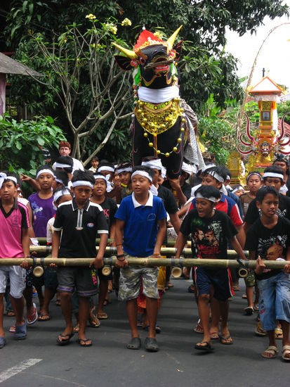 Am vierten Tag in Ubud liessen wir es ein wenig gemütlicher angehen. Wir hatten gehört, dass an diesem Tag eine Beerdigungszeremonie stattfand, wo die Seele eines kürzlich Verstorbenen in den Himmel kam aufgrund der Verbrennung eines Stieres aus brennbarem Material. Bei der hinduistischen "Verbrennungszeremonie" wird ein Stier gebaut, welcher eine genau festgelegte Strecke durch die Stadt bis zum Ort der Verbrennung getragen wird (in Ubud war es gleich neben einem grossen Tempel). Da der Stier in unserem Fall nicht so groß war, wurde er von einer Gruppe Kinder getragen. Diese hatten eine Menge Spass, denn das Tragen des Stieres erforderte ständige Richtungswechsel, also eine Art Zick-Zack-Lauf, damit die bösen Geister nicht Besitz von dem Stier ergreifen konnten.