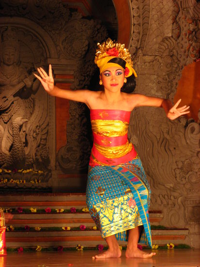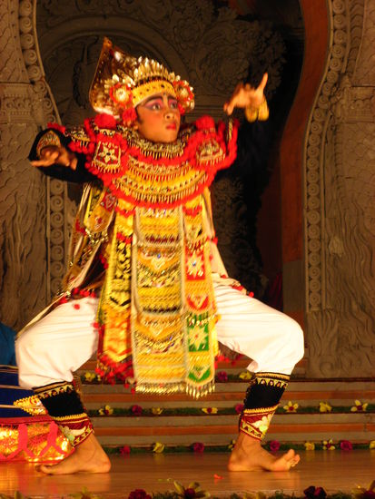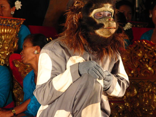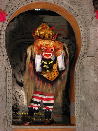 Bis zum Beginn der Zeremonie war leider schon eine Ewigkeit vergangen, sodass wir die aktuelle Verbrennung nicht mehr abwarteten. Stattdessen schwangen wir uns aufs Moped und fuhren auf den Markt nach..., wo wir ein paar schoene Souvenirs kaufen wollten. Unterwegs sahen wir dann doch noch eine Verbrennungszeremonie, wo sich viele Leute versammelt hatten und auch das Feuer recht gross war. Leider blieb uns zum Shoppen nur eine Stunde Zeit, viel zu wenig, um ausgiebig feilschen zu können. Immerhin kehrten wir mit einem Windspiel, zwei Bilderrahmen und ein paar anderen Kleinigkeiten zurück nach Ubud. An unserem letzten Abend mit Maaike und Vincent besuchten wir noch einmal eine Show. Diesmal schauten wir uns einen Batong-Tanz an, welcher uns auch sehr gut gefiel.
