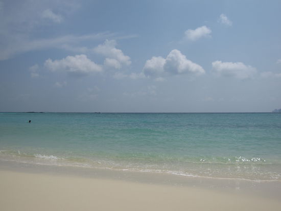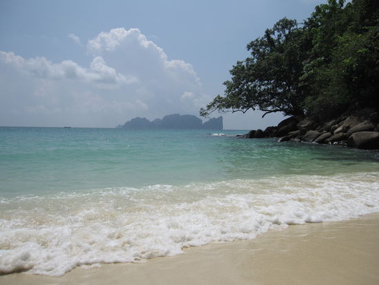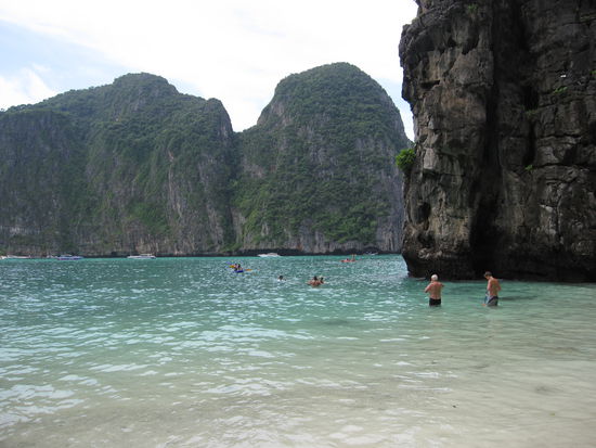 Am zweiten Tag buchten wir eine Schnorcheltour mit dem Highlight, die beruehmte Maya Beach aus dem Film "The Beach" zu sehen. Dieser Teil der Tour war am Ende allerdings der unspektakulaerste. Die Maya Beach wimmelte von Touristenbooten und vor lauter Müll wusste man kaum, wo man hintreten soll. Das war also der absolute Schock. Die beiden Snorchelstopps gefielen uns dafuer sehr gut, am besten war der Strand von Bamboo Island, wenn man den Kopf unter Wasser hielt, sah man viele farbige Fische, schaute man uebers Wasser, blickte man auf tuerkisfarbenes Wasser, weissesten Sandstrand und herrliche, naturgewachsene Palmen. Dort haetten wir den ganzen Tag bleiben koennen, aber wie das bei einer Tour nun mal ist, ging es leider schon bald wieder zurück nach Ko Phi-Phi.