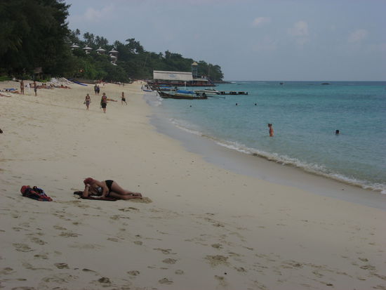 Auf den ersten Blick kam man sich auf Ko Phi-Phi vor wie auf der Kao Sun in Bangkok, nur dass die Gassen viel schmaler waren. Hier reihte sich Tauchshop an Tauchshop, Bar an Bar, Guesthouse and Guesthouse. Unser Guesthouse befand sich am Fusse des Berges, dort war es noch ein wenig ruhiger, obwohl es hier auch keinen Platz mehr zum bauen gab. Wir hatten uns erst Sorgen gemacht, dass Ko Phi-Phi etwas zu teuer fuer uns ist, waren deshalb angenehm ueberrascht, dass mit ein wenig suchen auch preiswerte Unterkuenfte und Restaurants zu finden waren. Am naechsten Tag entschieden wir uns erstmal fuers Relaxen. Das schoene Wetter hatte uns wieder eingeholt, also liehen wir uns eine Schnorchelausrüstung aus und liefen zum Long Beach an der Ostseite der Insel. Dort loesste ich mein Versprechen bei Irene ein und uebte mit ihr schwimmen. Der Strand gefiel uns hier wirklich sehr gut.