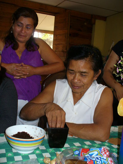 "Ich brauch erst mal ein kleines Gefäss mit 2,5 dl Wasser". Die erste Hürde. 2,5 dl, wie viel ist das? Natürlich gab es in diesem Haushalt kein Litermass. In einer grossen Tasse schätzte ich daher die Menge ab und legte die beiden Tabletten hinein. Und jetzt begann das grosse Staunen. Ist das wirklich Erde? Sie mussten mit Händen und Nase spüren und fühlen, wie sich die harten Tabletten verändert hatten. Esther schmeckte sogar mit der Zunge. "Ja es ist Erde, aber sie schmeckt anders als hier".