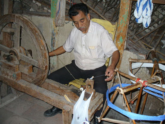 Während Juan weiterarbeitete, sah ich noch eine Weile seinem Kollegen zu. Dieser wickelte zwei dünne Fäden in blau und weiss auf eine Spindel, die er später in sein Webschiffchen spannen würde. Reden überliess er lieber seinem Arbeitskollegen, er konzentrierte sich auf seine Arbeit und so stellte ich ihm keine Fragen.