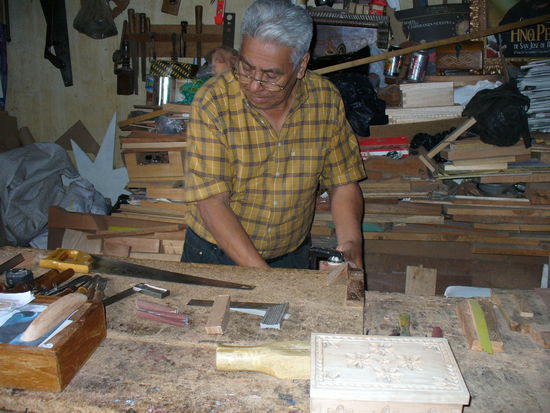 Doch dann erzählte er mir von seiner Arbeit. Er macht kleine Schmuckkästchen, deren Deckel er mit schönen Schnitzereien verziert. Manchmal gibt es auch grössere Aufträge, wie zum Beispiel die beiden Stühle, denen sein Mitarbeiter gerade den letzten Schliff gab. Sie würden morgen ausgeliefert. Ja, früher hatten sie auch grössere Arbeiten ausgeführt. Betten, Tische, sogar Schränke wurden auf Auftrag hergestellt. Da hatte er auch noch 5-6 Mitarbeiter und eine grössere Werkstatt. Heute waren es meist kleine Arbeiten.