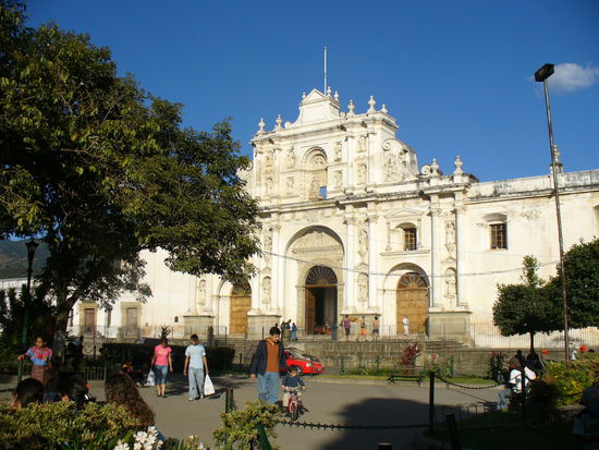 Der Parque Central, dieser quadratische Park in der Mitte der kolonialen Stadt mit den parallelen Strassen die von Süden nach Norden und von Westen nach Osten verlaufen. Hinter mir steht die Kathedrale, respektive das, was nach dem letzten Erdbeben vor 300 Jahren noch von dieser stolzen Kirche übrig geblieben war. Weiss leuchtet die Fassade mit den vielen steinernen Heiligen im Sonnenschein.