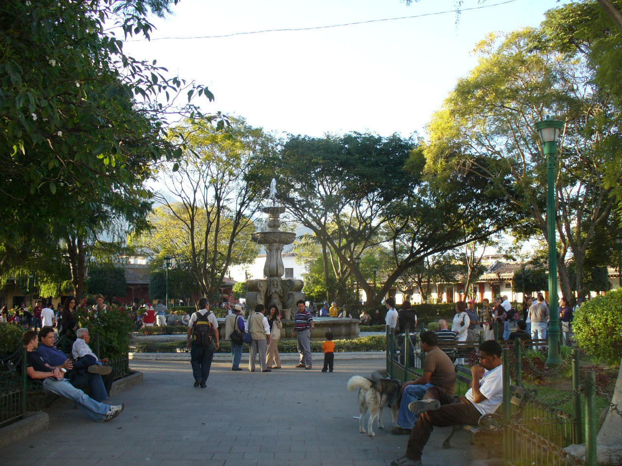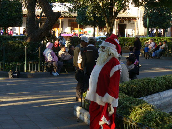 "Du bist bleich" hatte mir Rebeca bei der Begrüssung gesagt, "du brauchst unbedingt etwas Sonne" Kein Wunder bei dem Hochnebel, den wir in den letzten Wochen in der Innerschweiz hatten. Also setze ich mich an diesem warmen Sonntagnachmittag in den Parque Central auf die einzige Bank, die von der Sonne beschienen ist. Es ist auch die einzige Bank, die noch frei ist, denn die Guatemalteken halten sich gern im Schatten auf.