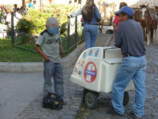 Im Park wimmelt es von Menschen. Schwarzhaarige junge Frauen in traditionellen langen Röcken bummeln zu zweit oder in Gruppen. Sie tragen die typischen Trachten aus dem ganzen Land. Junge Männer, die sich ihrer Wirkung auf die Frauen mit jedem Zentimeter bewusst sind, alte Greise, die beim Lächeln eine Reihe schwarzer Zähne zeigen, faltige Gesichter unter steifen Cowboyhüten. Links neben mir liegt ein Penner im Gras. Notdürftig versucht er aus einem Plastiksack ein Kissen zu basteln. Touris bummeln durch den Park, immer auf der Suche nach dem spektakulärsten Bild, dem besten Blick auf die Kathedrale und den Brunnen.