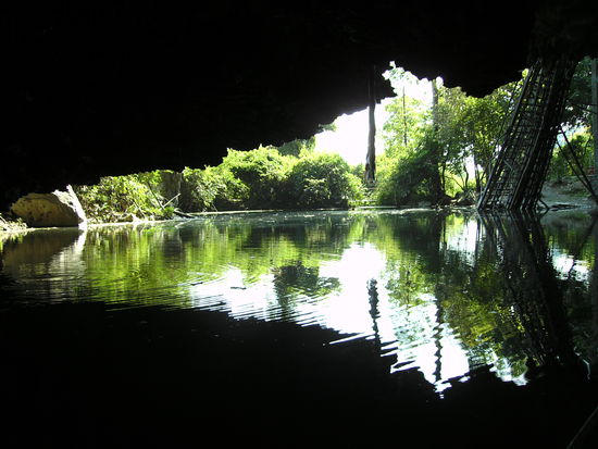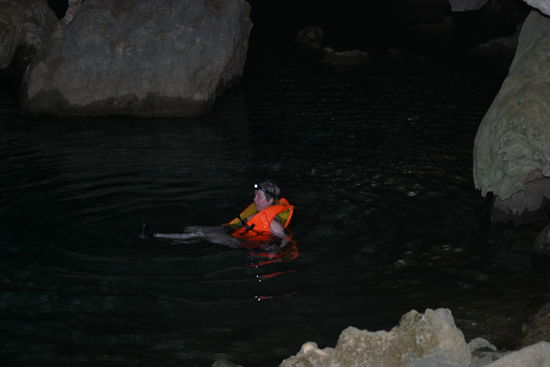Um fuenf vor acht klopft es schon an unsere Tuer, los gehts!! Wir fahren mit dem TukTuk in die Berge - eine tolle Landschaft. Wir kommen durch kleine laotische Doerfer, Reisfelder und irgendwann werden wir mit Schwimmwesten an der Strasse abgestellt. You want to swim? Yes. You wait here. Die Schweine laufen frei, unser guide sucht den lokal guide. Der hat aber scheinbar etwas besseres vor, so ziehen wir alleine los. In den Wald. Die erste Hoehle ist ein zugiges Loch und gleich ist klar, dass ich das nicht jeden Tag tue... Dann gehts nochmal recht weit durch den (Ur-)wald und wir klettern zu der Hoehle, wo wir schwimmen koennen. Ein bischen gruselig ist das schon, hier ist keine Menschenseele. Wir haben unser Licht dabei aber der guide nicht, jetzt noch die Schwimmwesten und mutig hinter dem guide her. Es wird immer dunkler. Oben ein Wald von Stalagtiten und unten sicher auch. nach ca. 50 od. 100 Metern muessen wir klettern, dann weiter. Es wird immer dunkler. Das Wasser ist toll aber ich finds unheimlich. Es geht wohl insgesamt 800 m rein, wir waren nur 200 m. Und ganz klare Felsen und Stalagmiten. Nachts kommen hier die Fledermaeuse.