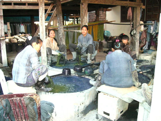 Die Thai-Lao Freundschaftsbruecke ist in Betrieb! Savannakhet richtet sich auf mehr Betrieb ein, ist aber immer noch ein ruhiges Staedtchen. Wir geniessen das Mekong-Flair und besuchen eine Weberei. Hier wird Baumwolle mit Naturfarben behandelt, wir duerfen zusehen und die Maedels freuen sich, wenn wir fotografieren.