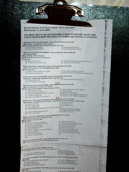 Ja wir mussten ach noch wochentlich unsere Miete entrichten 150$, das tat oft weh so schwer verdientes Geld einfach wieder herzugeben. Aber Es wird ja auch geschaut dass man jeden tag Arbeit hat. Das laeuft wie folgt ab: es wurde meisst gegen 8.00pm am Vortag eine Worklist (Arbeitsliste) ausgehangen wo draufstand wer, wo, was arbeitet wann Abfahrt ist, was mann braucht(Sonnenschutz, Wasser, Lunch,Handschuhe, lange Kleidung etc.) und wie letztendlich gezahlt wird (welche Formulare man ausfuellen muss).