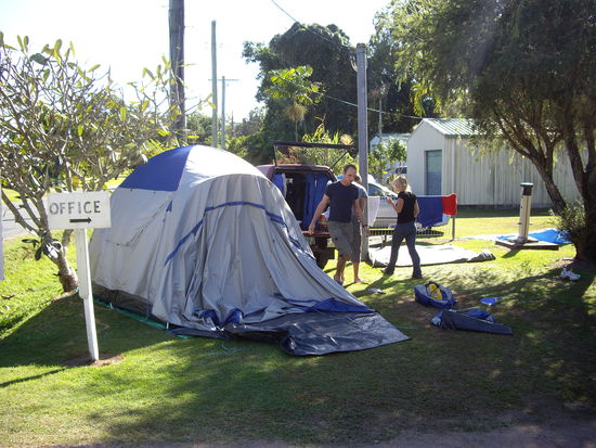 Nun wir lernten eine weiter gute Seite an Australien und ihren Einwohnern kennen, die Campingplatz Besitzerin, eine alte aber sehr freundliche Dame die uebrigens selber in einem umgebauten grossen Reisebus lebt, hat dann noch "mitten in der Nacht" einige Camper aktiviert, doch bitte ihre Fahrzeuge etwas umzuparken damit wir unser zwei Zelte doch noch aufstellen konnten.
