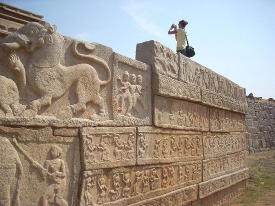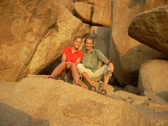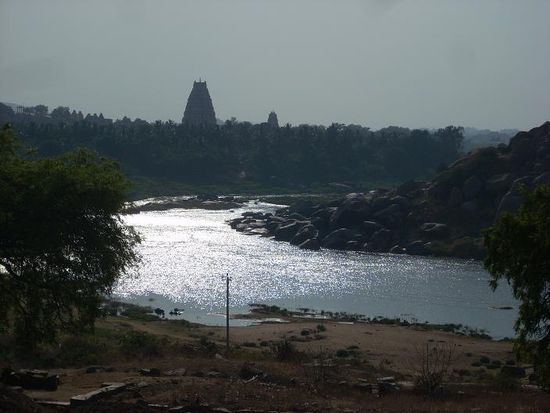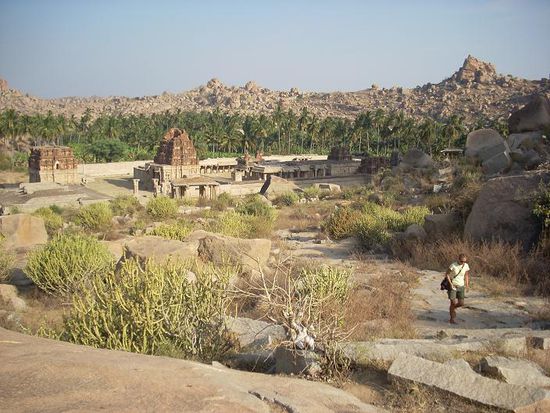 Am naechsten Tag starteten wir zu einen ersten Sparziergang durch Hampi. Der Ort ist durch zwei Dinge gespraegt. Erstens die Ruinen alter Tempel aus dem 9-15 Jhd. und zweitens durch unendlich viele Granit-Felsbrocken, die in allen Groessen und Formen ueberall herumliegen. Aus den Felsbrocken wurden damals Granitbloecke gewonnen, aus denen die Tempel und andere Gebaeude der Stadt gebaut wurden.