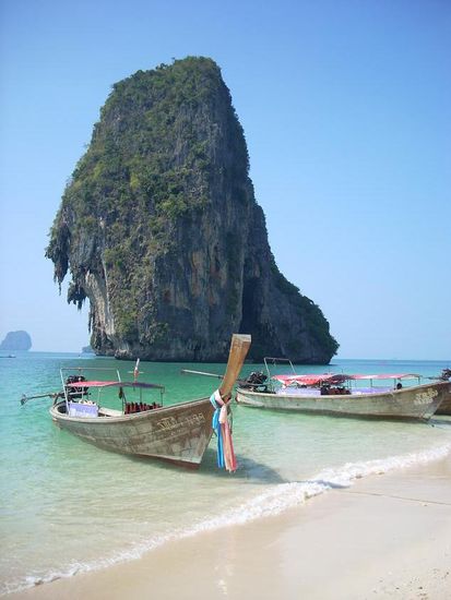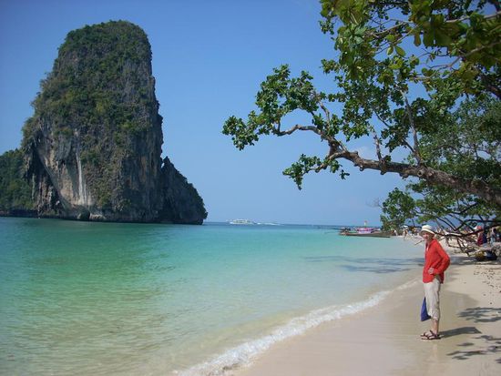 Der Strand war auch gleich unser erstes Ziel. Nachdem wir uns noch ein wenig frisch gemacht haben, gingen wir gleich zum Pier um ein Longtailboat zum Strand von Railey zu nehmen. Die Fahrt dauert 45 Minuten und man kann dabei ganz wunderbar die tolle Felslandschaft hier bewundern. Vielleicht waere es guenstiger direkt in Railey in den Resorts zu uebernachten aber der Ort Krabi bietet fuer den Abend mehr Abwechslung, den Railey ist nur Strand, noch mehr Strand, Felsen und Hotels. Traumhaft schoen aber auf Dauer vielleicht langweilig. Jedoch tagsueber nicht, denn es gibt dort genug Aktivitaeten wie Kajak fahren um kleinen Felsen, Klettern auf die grossen Felsen und wohl auch Schnorcheln.