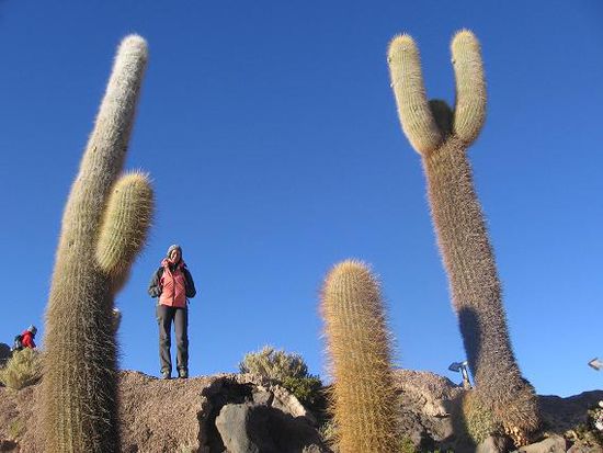 Wir kamen auch zu einer "Insel" im Salar, von der wir den Namen nicht mehr genau wissen, aber es wuchsen dort Unmengen von Kakteen - Julia war ganz hin und weg.