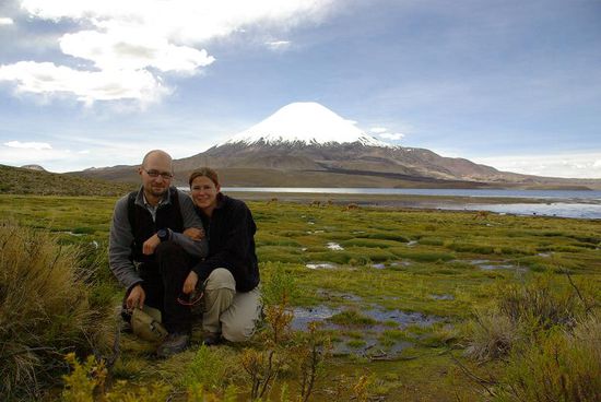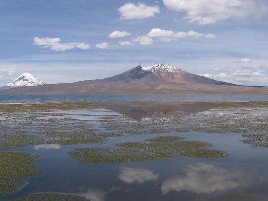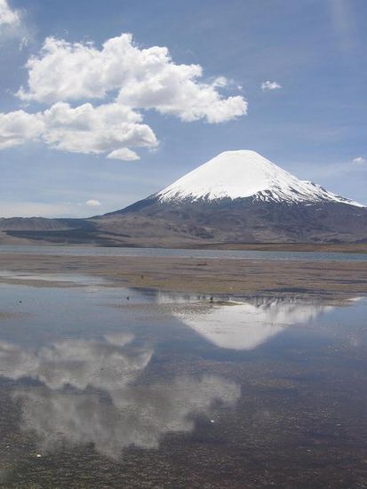 Wir konnten hier einige Zeit am Ufer der Lagune Chungara herumlaufen und die Aussicht geniessen. Auch den Vulkan Sajama auf der bolivianischen Seite, uebrigens der hoechste Berg Boliviens, konnten wir von dort aus sehen.