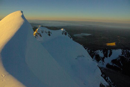 Die meisten fahren zum Refugio, probieren einen Tag lang das Gehen mit Steigeisen und Pickel, und beginnen dann den Aufstieg zum Gipfel am zweiten Tag. Wir wollten einen anderen ersten Tag, und sind deshalb mit dem Club Andino zum Chakaltaya gefahren, dem hoechstgelegenen Schigebiet der Welt mit der Bergstation auf 5300 Meterm. Im Moment war sie allerdnigs wegen Schnee- (und Gletscher-) Mangel nicht in Betrieb. Wir sind zu Fuss zum ersten Gipfel, haben die Aussicht genossen, und sind nach einem kleinen Imbiss wieder zurueck zum Refugio des Club Andino.