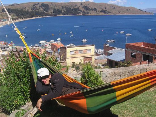 Copacabana ist auch der perfekte Ort, um eine Spezialitaet Boliviens zu probieren: Truchas, also Forellen, aus dem Titicacasee. Gleich am ersten Abend haben wir uns eine kleine Bude am Strand gesucht, und wirklich perfekt gegrillte Forelle um nicht einmal 2 Euro gegessen. Wir konnten wieder nur staunen, wie toll man in Bolivien fuer wenig Geld essen kann. Dazu bekamen wir auch noch einen Sonnenuntergang serviert, die Sonne tauchte dabei gluehend rot in den Titicacasee ein. Fast hatte man das Gefuehl, man sitzt am Meer. Das wird noch dadurch verstaerkt, dass der Titicacasee einer der groessten Seen der Welt ist (ca. 13mal groesser als der Bodensee), und man das gegenueberliegende Ufer nicht sieht.