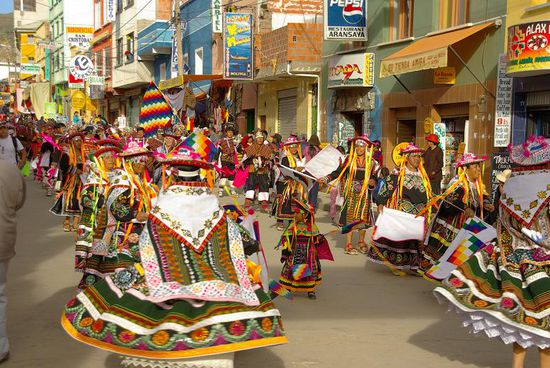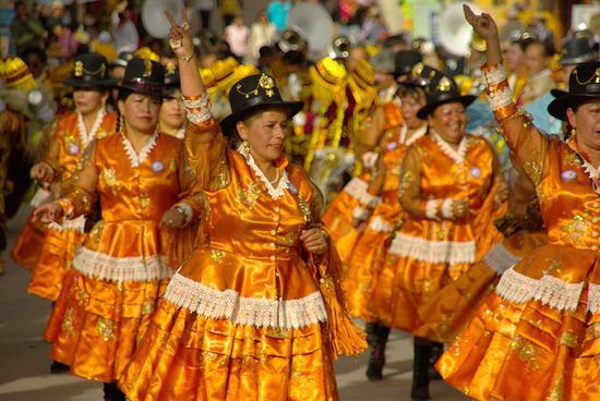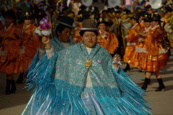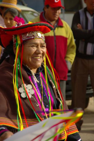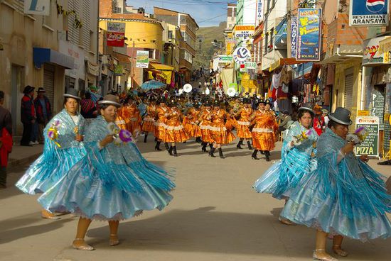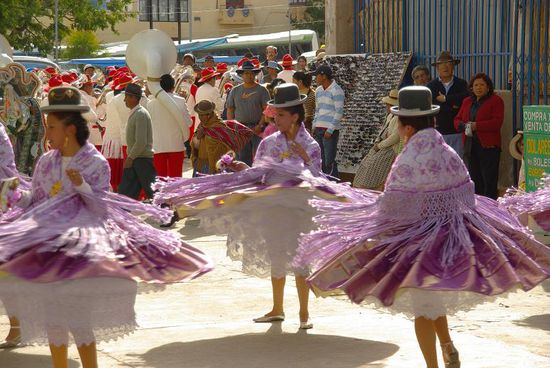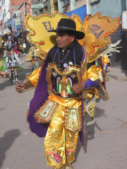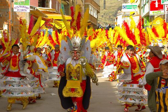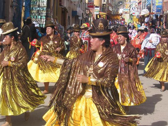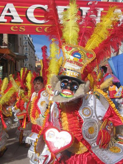 Unser Haupt haben wir im Hostal Aransaya auf frische gewaschene Laken gebettet, und die Nachtruhe wurde nur durch die Blechblasmusik gestoert, die wir bis spaet abends und dann wieder von 5 am Morgen an gehoert haben. Wir hatten da schon so eine Ahnung, was uns erwarten wuerde, und es war wirklich unglaublich! Den ganzen Tag haben die Leute auf den Strassen getanzt, die Musikkapellen haben dazu gespielt, und eine Menge Bier ist dabei geflossen. Die Musikanten haben hier anscheinend auch einen seltsamen Kontest. Alle spielen dasselbe Lied, aber nicht synchron sondern schoen durcheinander, und der, der am lautesten spielt, hat glaub ich gewonnen. Oder vielleicht lags auch am uebermaessigen Bierkonsum! Fuer unsere Ohren war das zu Beginn jedenfalls sehr anstrengend, aber man gewoehnt sich daran. Und am Ende wurde daraus sogar ein richtiger Ohrwurm, den wir lange nicht los wurden. Das Fest ging jedenfalls wieder bis spaet in die Nacht, nur mussten am Ende schon einige Verluste verzeichnet werden . Einige Bolivianer machten nicht mehr den Eindruck, als haetten sie alle ihre Gliedmassen unter Kontrolle. Es war aber toll, so ein bolivianisches Volksfest einmal mitzuerleben.