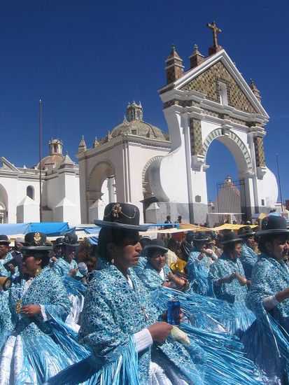 Wir sind zu einem perfekten Zeitpunkt nach Copacabana gekommen. Wir haben schon in La Paz erfahren, dass zwischen 1. und 3. Mai ziemlich grosse Feiern stattfinden. Erster Mai wie bei uns Tag der Arbeit, und 3. Mai das grosse Fest zu Ehren der Pachamama, der Mutter Erde. Wir haben uns schon auf einiges gefasst gemacht, aber was wir dann gesehen haben, hat alles uebertroffen. Schon am 2., als wir ankamen, waren die Strassen gefuellt mit bunt maskierten Leuten und Musikanten, die von einem Ende der Stadt zum anderen gezogen sind.