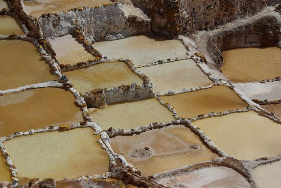 Der letzte Stop vor Ollanta waren die Salineras in der Naehe des Ortes Maras. Dort entspringt eine SALZwasserquelle aus dem Berg, die auch schon die Inkas gekannt und zum Salzabbau verwendet haben. Fast 5000 Becken wurden gebaut, in denen das Wasser verdampft und das Salz am Grund liegenbleibt. Die ganze Anlage sieht etwas antik aus, aber dort wird immer noch Salz abgebaut und verkauft.
