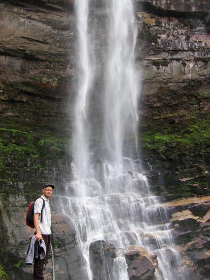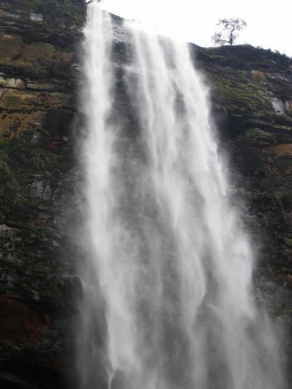 Danach kamen wir zum Mirador, von wo man einen fantastischen Blick auf das ganze Tal und den Wasserfall hat. Nach einer weiteren Stunde waren wir dann direkt beim Wasserfall, allerdings nur beim oberen Teil. Man sieht dadurch die Maechtigkeit nicht wirklich, weil der obere Teil vielleicht nur ein Viertel der Hoehe ausmacht. Man kann auch zum unteren Teil des Wasserfalles wandern, dazu muss man allerdings von Cocachimba starten, was auf der anderen Seite des Tales liegt. Das waere vielleicht die bessere Variante gewesen.