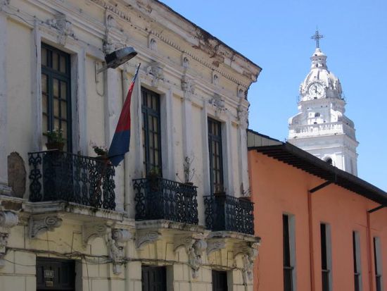 Wenn mans weiss, dann erkennt man hinten zwischen den Türmen der Basilica die Marienstatue am Panecillo.